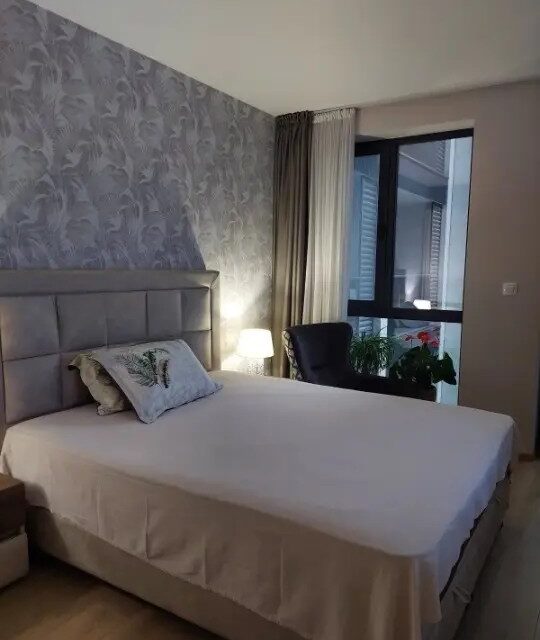 Агенция БИМ продава с офертен номер 1632 двустаен апартамент с паркомясто, център Пловдив, първи собственик. Продаваните жилище и паркомясто се намират в луксозния комплекс Платинум , Апартаментът е със застроена площ от 74.93кв.м., разположен е в средната секция на комплекса, на етаж 5 (четвърти жилищен) от 11-етажна жилищна сграда, и се състои от дневна-трапезария, спалня, баня-тоалетна, антре и тераса. Напълно обзаведен с всички нужни за живеене мебели, уреди и два броя инверторни климатици; луксозна дограма. Дневна зона: под ламинат; стени латекс и боя; кухня с вградени печка, котлони, пералня, съдомиялна и мивка; хладилник; трапезна маса за хранене с 4 стола; италианска секция и холна маса; диван. Спалня: под ламинат; стени латекс и боя; спалня, нощни шкафчета, гардероб и скрин. Антре: под ламинат и монтирано портманто; Баня под: гранитогрес; стени – фаянс; монтирани: мивка с батерия; тоалетно шкафче; тоалетна; място, отделено със стъклена предграда за душ-батерия, и бойлер. Тераса гранитогрес. Секцията, включително избения й етаж, се обслужват от два големи асансьора. Общи части на секцията луксозни; просторни. Контролиран достъп за външни лица камери, домофонна система; отключване – с чип и с ключ. Паркомястото е с площ от 11.50кв.м., ситуирано във вътрешния двор.